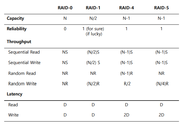 이제 스트라이핑 방식의 용량, 신뢰성, 그리고 성능을 평가해 보자. 용량 측면에서는 완벽하다. N개의 디스크에서 스트파이핑은 블럭 개수의 N배 용량(B(block) * N)만큼의 유효 용량을 갖는다. 신뢰성 측면에서는 스프라이핑은 역시 완벽하지만 나쁜 의미로 완벽하다. 어느 디스크라도 고장 나면 전체 데이터가 손실된다. 마지막으로 성능은 훌륭하다. 병렬로 사용자의 I/O 요청을 처리할 수 있기 때문에 모든 디스크가 활용한다.