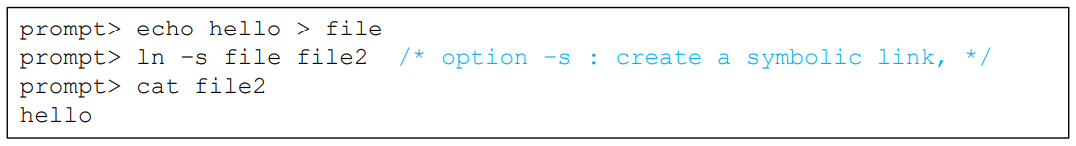 만드는 방법은 하드링크와 비슷해 보인다. 원래의 파일은 기본의 이름인 file 뿐만 아니라 이제 file2라는 심볼릭 링크 이름으로도 접근할 수 있다.