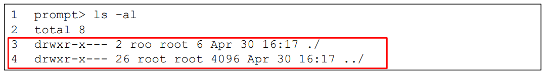 처음 디렉터리가 생성되면 빈 상태이지만, 사실 아주 기본적인 내용이 들어 있기는 하다. 빈 디렉터리에는 실제로 두 개의 항목이 존재한다. 하나의 항목은 디렉터리 자신을 나타내기 위한 것이고, 다른 항목은 자신의 부모 디렉터리를 가리키기 위한 것이다. (전자는 "."(dot), 후자는 ".."(dot-dot)이라고 한다) 이를 확인하기 위해서는 ls 명령에 -a 플래그를 전달하면 된다.