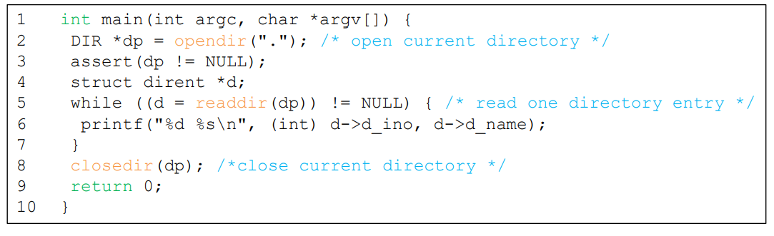 이 프로그램은 opendir(), readdir(), 및 closedir()를 사용한다. 간단한 반복문을 사용하여 디렉터리 항목을 하나씩 읽은 후에 디렉터리의 각 파일의 이름과 아이노드 번호를 출력한다. dirent 구조체는 자료 구조 형태의 각 디렉터리 항목에 저장된 정보를 보여준다.