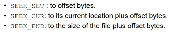 첫 번째 인자는 파일 디스크립터이다. 두 번째 인자는 offset으로 파일의 특정 위치를 가리킨다. 세 번째 인자는 역사적인 이유로 whence라고 부르며 탐색 방식을 결정한다. 다음과 같은 키워드로 설정할 수 있다.