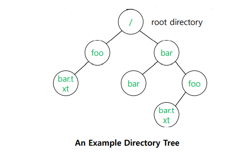 위 그림에 나타난 좀 더 복잡한 디렉터리 트리를 살펴보자. 그림에서 유효한 디렉터리들은 /, /foo, /bar, /bar/bar, /bar/foo이고 유효한 파일들은 /foo/bar.txt와 /bar/foo/bar.txt이다. 디렉터리들과 파일들은 파일 시스템 트리 안에서 서로 다른 위치에 있는 경우, 동일한 이름을 가질 수 있다. (bar.txt는 서로 이름은 같지만 다른 위치에 있기 때문에 존재할 수 있다)