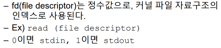 open()에 가장 중요한 항목은 리턴 값이다.(파일 디스크립터(file descriptor)) 파일 디스크립터는 프로세스마다 존재하는 정수로서 UNIX 시스템에서 파일을 접근하는 데 사용된다. 물론 해당 파일에 대한 권한을 갖고 있어야 한다. 이러한 측면에서 파일 디스크립터는 특정 동작에 대한 수행 자격을 부여하는 핸들이다. 파일 디스크립터를 파일 객체를 가리키는 포인터로 볼 수도 있다. 그러한 객체를 생성하면, read() 또는 write()와 같은 다른 메소드로 파일에 접근할 수 있다.