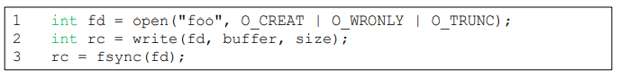 fsync()를 사용하는 방법에 관한 간단한 예제(위 그림)를 살펴보자. 코드에서 foo라는 파일을 열어서 데이터를 하나 쓴다. 그리고 나서 fsync()를 호출하여 해당 블럭을 즉시 디스크에 강제적으로 기록한다. fsync()가 리턴하면 응용 프로그램은 데이터가 영속성을 갖게 되었다는 것을 보장받기 때문에, 안전하게 다음으로 진행할 수 있다.