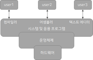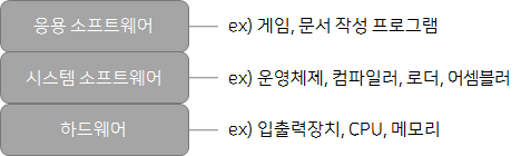 이러한 소프트웨어들은 계층적으로 구성된다. 크게 하드웨어와 응용 소프트웨어로 구분할 수 있고 이 사이에는 여러 가지 시스템 소프트웨어가 존재한다.