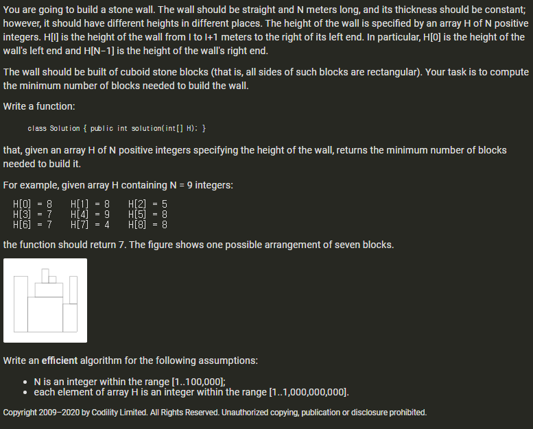 N개의 원소가 담긴 배열 H가 주어진다. H[0] ~ H[N-1] 까지의 원소에는 벽의 높이 값이 들어간다. 이때 H 높이들을 만족하는 벽을 쌓기 위해서 최소 몇 개의 블럭이 필요한지를 구하는 문제이다.
