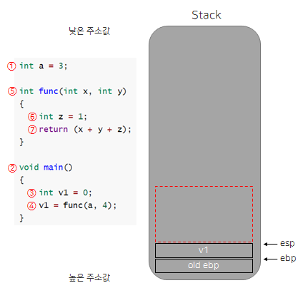 위 그림을 보면 main 함수가 실행되면서, old ebp가 스택에 쌓이는 것 (push)을 볼 수 있다. 이는 함수가 실행될 때마다 일어나는 일로, 이전에 실행중이던 상태로 돌아가기 위해 레지스터 값을 저장하는 것이다. 이미지에서는 ebp라고만 적혀있지만, 당시 사용 중이던 레지스터가 존재한다면 그 값들도 함께 저장된다. 이것 또한 함수의 실행이 종료되면, 저장해둔 값을 꺼내서 원래의 상태로 돌아가기 위함이다.