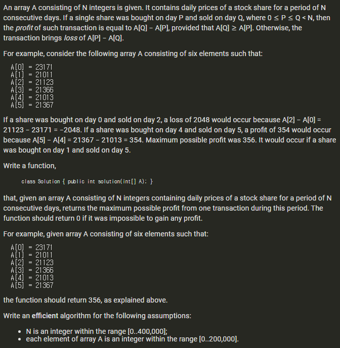 N개의 정수를 담는 배열 A가 주어진다. 0 <= P <= Q < N 조건을 만족하는 P, Q 중에서 A[Q] - A[P]가 가장 큰 값을 리턴하는 문제이다. 만약 값을 구할 수 없거나 가장 큰 값이 음수라면 0을 리턴한다.