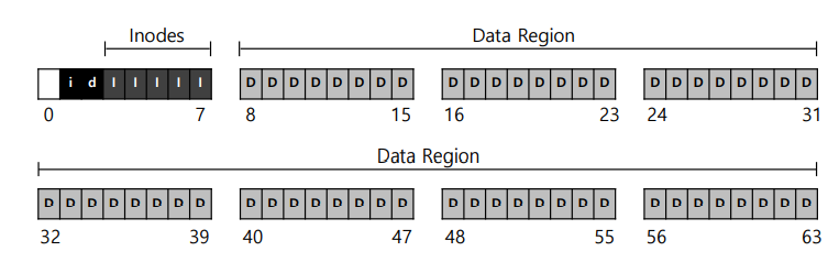 우리가 파일 시스템을 만들려는 디스크 파티션 구조는 단순하다. 4KB 블럭들로 나열되어 있다. N개의 4KB블럭의 크기를 갖는 파티션에서 블럭은 0부터 N - 1까지의 주소를 가지고 있다. 블럭이 64개 있는 작은 디스크를 가정하자.