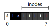 그럼 이제 남은 한 블럭의 존재는 무엇일까? 이 블럭은 슈퍼블럭(superblock)을 위한 공간이다. 슈퍼블럭은 이 파일 시스템 전체에 대한 정보를 담고 있다. 예를 들면 파일 시스템에 몇 개의 아이노드와 데이터블럭이 있는지, 아이노드 테이블은 어디서 시작하는지 같은 정보를 담고 있다. 파일 시스템을 식별할 수 있는 매직 넘버도 갖고 있을 것이다. 파일 시스템이 깨진다는 것은 곧 슈퍼블럭이 저장된 디스크 블럭이 훼손되는 것이다. 일반적으로 대부분의 파일 시스템은 슈퍼블럭을 몇 개 복사해둔다. 아래 그림에서는 S라고 표기된 위치의 블럭이 슈퍼블럭이다.