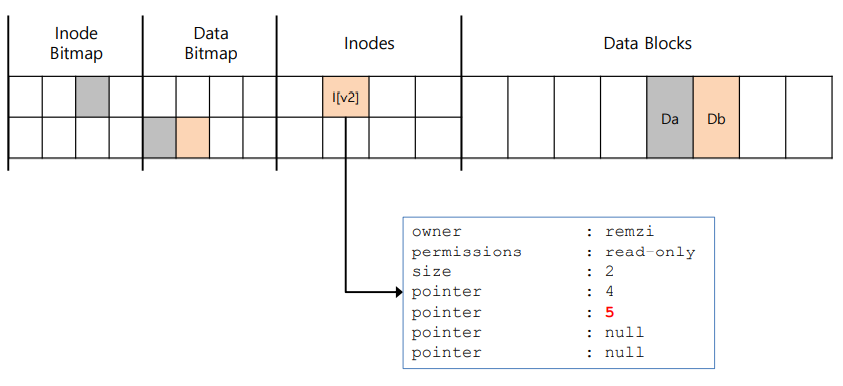 이 파일의 끝에 내용을 추가한다는 것은 새로운 데이터 블럭을 추가하는 것이다. 세 개의 디스크 자료 구조를 갱신해야 한다. 아이노드와 새로운 데이터 블럭 Db, 그리고 데이터 비트맵(B[v2]라 하자)이다. 새로운 블럭은 사용 중이 된다.