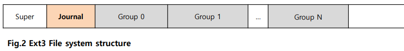 저널 영역이 동일한 파일 시스템 파티션에 있다면 저널 영역을 포함하는 ext3파일 시스템은 다음과 같이 구성된다.