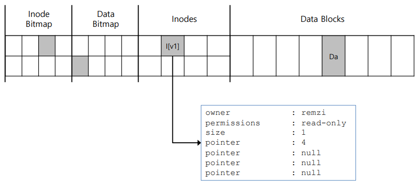 아이노드 테이블을 보면 2번 아이노드가 할당되어 있다. 아이노드 비트맵에서 세 번째 비트가 설정되어 있다. 이 파일은 4번째 데이터 블럭을 사용하고 있다. 데이터비트맵의 4번째 비트가 사용 중으로 표시되어 있다. 아이노드는 첫 번째 버전이기 때문에 I[v1]으로 표시되어 있다.