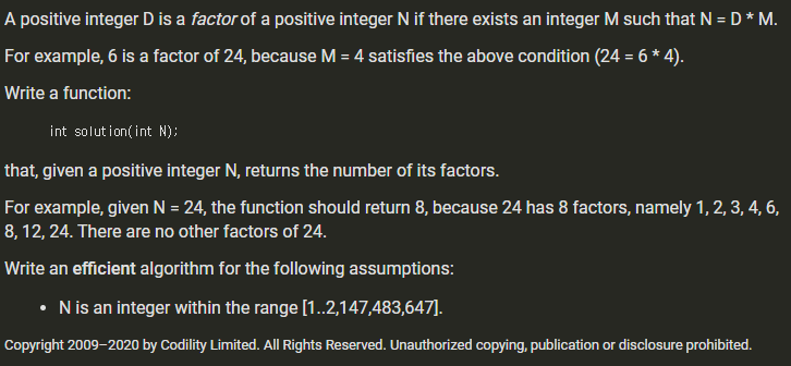N = 24인 경우 24의 약수는 1, 2, 3, 4, 6, 7, 12, 24 이므로 총 8개 이므로, 답은 8이다.