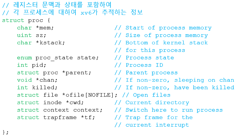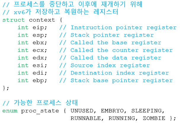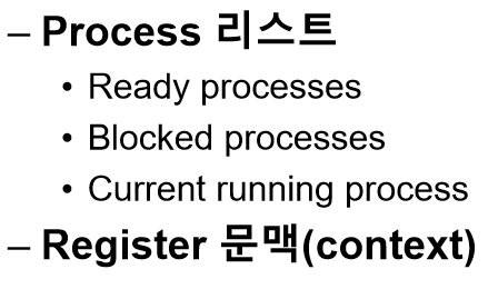 운영체제도 일종의 프로그램이다. 다른 프로그램들처럼 다양한 정보를 유지하기 위한 자료 구조를 가지고 있다. 예를 들면, 프로세스 상태를 파악하기 위해 준비 상태의 프로세스들을 위한 프로세스 리스트(Process list)와 같은 자료 구조를 유지한다. 또한 어느 프로세스가 실행 중인지 파악하기 위한 부가적인 자료 구조도 유지한다. 운영체제는 또 대기 상태인 프로세스도 파악해야 한다. 입출력 요청이 완료되면 운영체제는 적절한 프로세스를 깨워 준비 상태로 다시 전이시킬 수 있어야 한다.