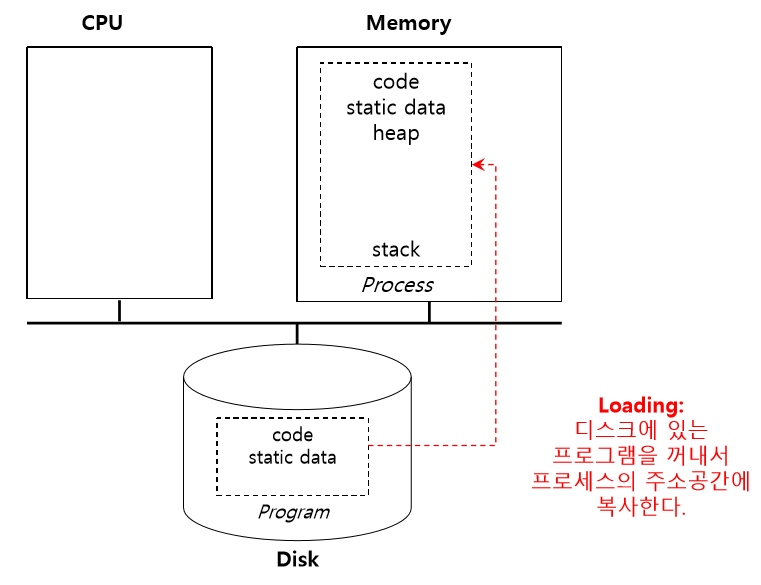 앞에서 계속해서 프로세스라는 단어가 나왔는데, 도대체 무슨 뜻일까? 프로세스(Process)는 운영체제가 제공하는 핵심 개념 중 하나로 실행 중인 프로그램이다. 프로그램 자체는 생명이 없는 존재와 같다. 프로그램은 디스크 상에 존재하며 실행을 위한 명령어와 정적 데이터의 묶음일 뿐이다. 이것들을 읽고 실행하여 프로그램에 생명을 불어넣는 것이 운영체제이다.