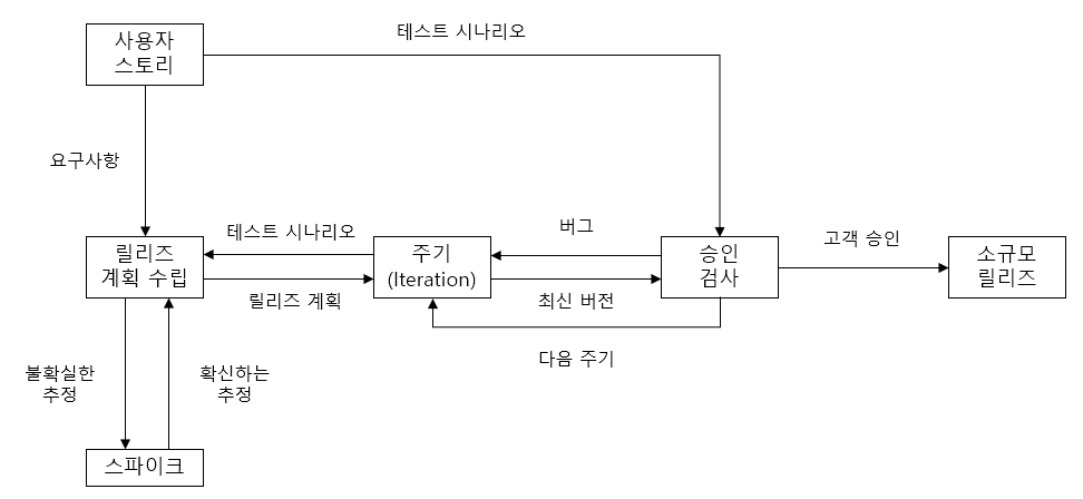 릴리즈(요구사항이 적용된 부분적 기능이 완료된 제품을 제공)의 기간을 짧게 반복하면서 고객의 요구사항 반영에 대한 가시성(대상을 확인할 수 있는 정도)을 높인다.