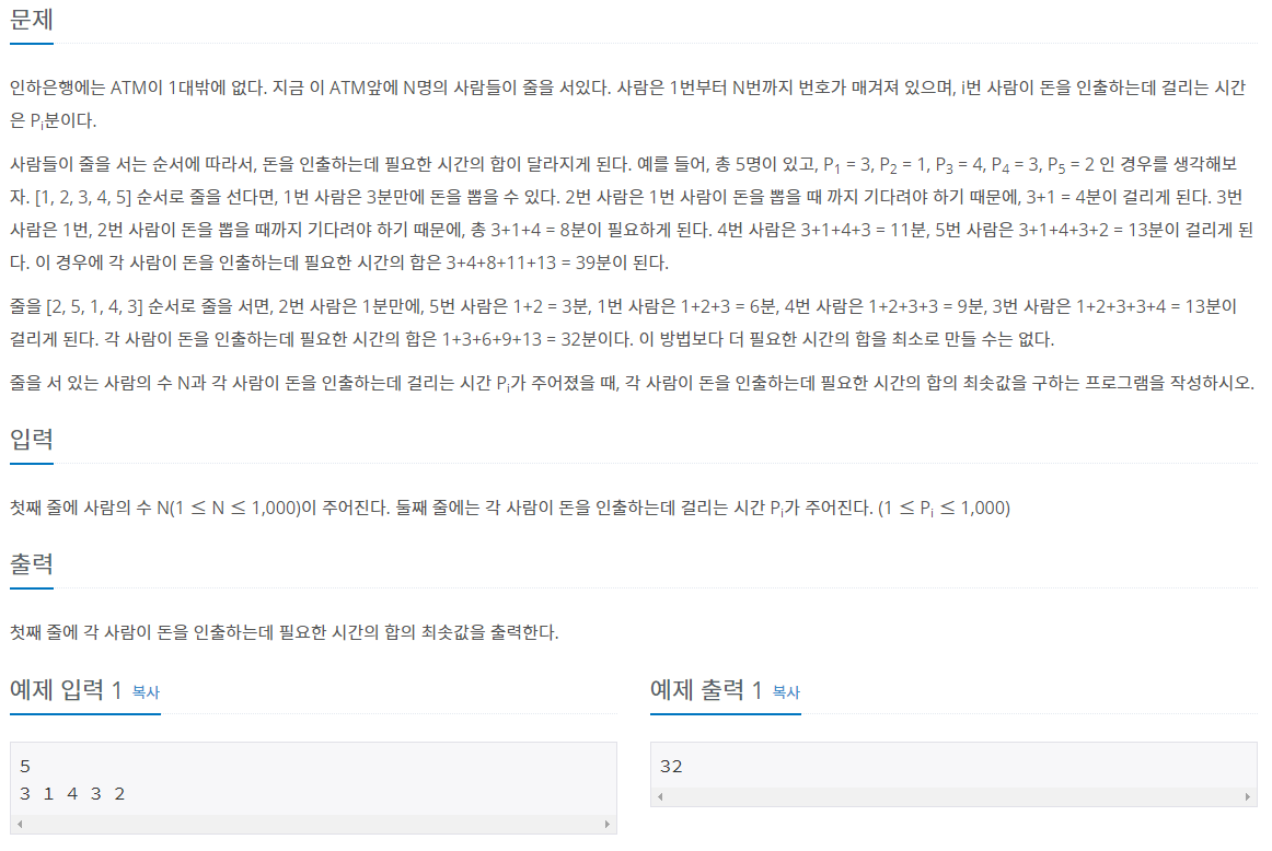 정렬을 할 줄 안다면 정말 쉬운 문제이다. 시간의 합이 최소가 되기 위해서는 각 사람이 돈을 인출하는데 필요한 시간을 오름차순으로 정렬하면 된다.
