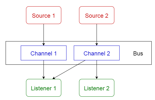 - 소스가 특정 채널에 이벤트 메시지를 발행하면, 해당 채널을 구독한 리스너들이 메시지를 받아 이벤트를 처리하는 방식