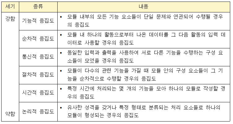 다양한 기준으로 모듈을 구성할 수 있으나 응집도가 강할수록 품질이 높고, 약할수록 품질이 낮다.