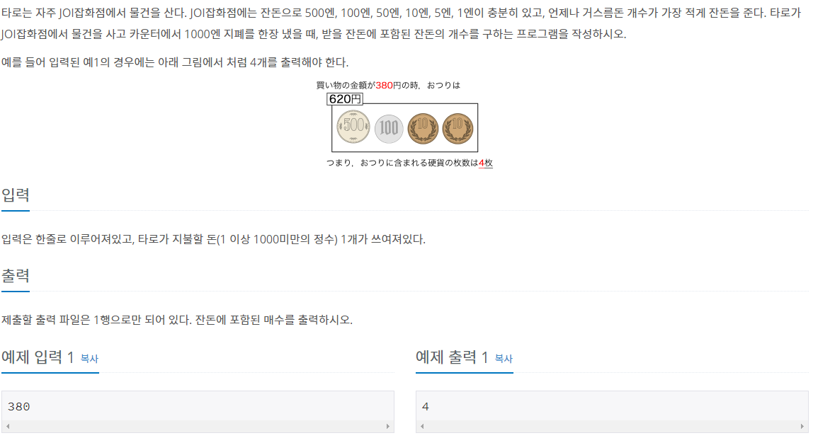 그리고 500엔부터 차례대로 거스름돈 보다 가치가 적거나 같은 경우 그 가치에 맞는 동전 개수를 구한 후 최종 값에 더해주고, 거스름돈에서 구한 만큼의 가치를 빼주면 된다.