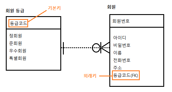 비식별관계 : 개체 A, B 사이의 관계에서 A 개체의 기본키가 B 개체의 비기본키 영역에서 외래키가 되는 관계