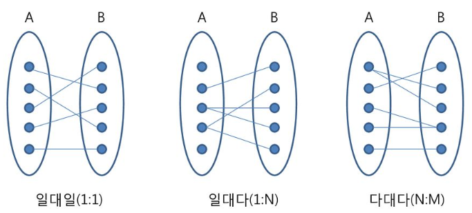 일 대 대(1 : N) : 개체 집합 A의 각 원소가 개체 집합 B의 원소 여러 개와 대응하고 있지만, 개체 집합 B의 각 원소는 개체 집합 A의 원소 한 개와 대응하는 관계
