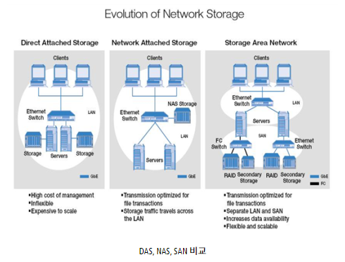 Ethernet 스위치를 통해 다른 서버에서도 스토리지에 접근할 수 있어 파일 공유가 가능하고, 장소에 구애받지 않고 저장장치에 쉽게 접근할 수 있음