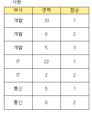ROW_NUMBER() OVER (PARTITION BY 부서 ORDER BY 경력 DESC) AS 짬순