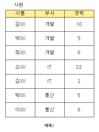 WHERE 사원.경력 >= 10 ANS 사원.이름 = 취미.이름