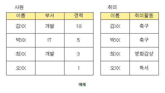 SELECT 사원.이름, 사원.부서, 취미.취미활동