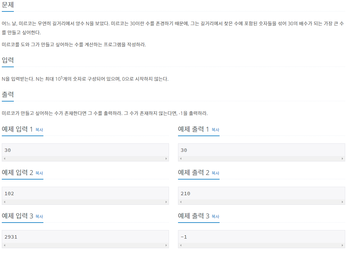 30 (백준 - 10610번) 본문