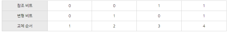 다음과 같이 참조 비트와 변형 비트의 값에 따라 교체될 페이지의 순서가 결정됨