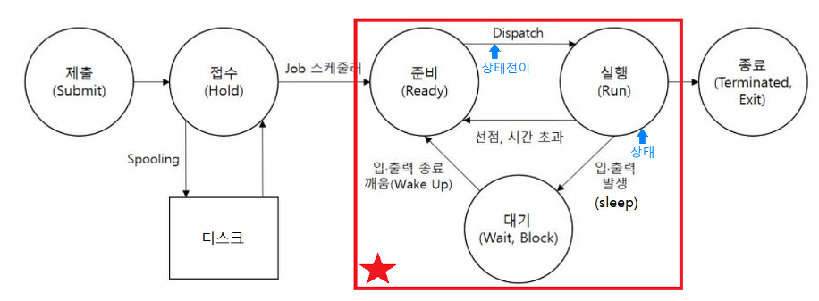 대기(Wain), 보류, 블록(Block) : 프로세스에 입출력 처리가 필요하면 현재 실행중인 프로세스가 중단되고, 입출력 처리가 완료될 때까지 대기하고 있는 상태