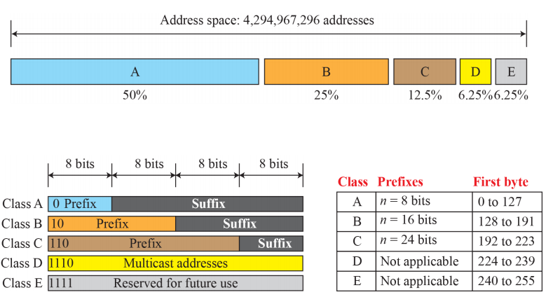 IP 주소는 네트워크 부분의 길이에 따라 다음과 같이 A 클래스에서 E 클래스까지 총 5단계로 구성되어 있다.
