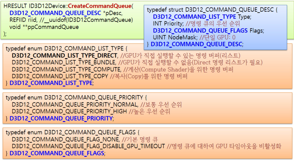 GPU 명령을 실행하기 위해서는 명령 대기열을 생성해야 한다. 명령 대기열을 대표하는 인터페이스는 ID3D12CommandQueue이다. 이 인터페이스를 생성 하려면 대기열을 서술하는 D3D12_COMMAND_QUEUE_DESC 구조체를 채운 후 CreateCommandQueue를 호출해야 한다.
