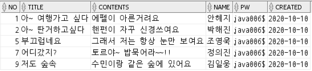 (SEQ_BOARD.NEXTVAL, '여기는 숲속', '저는 피톤치드에 중독되었어요', '허수민', 'java006$', SYSDATE);