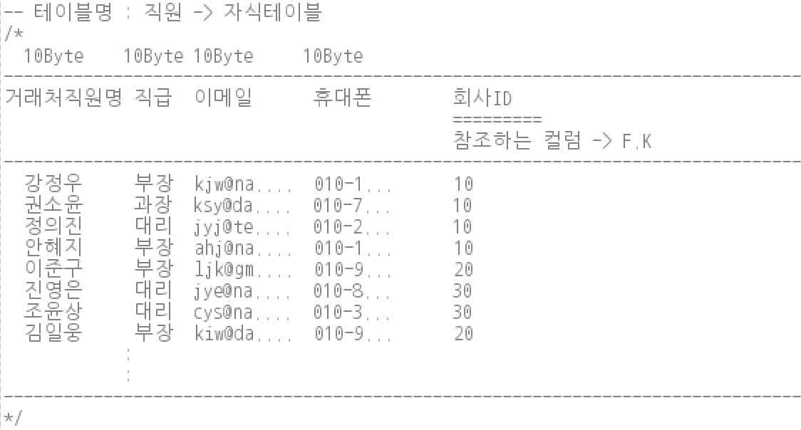 제 1 정규화를 수행하는 과정에서 분리된 테이블은 반드시 부모 테이블과 자식 테이블의 관계를 갖게 된다. 여기서는 회사 테이블이 부모, 직원 테이블이 자식이 된다.
