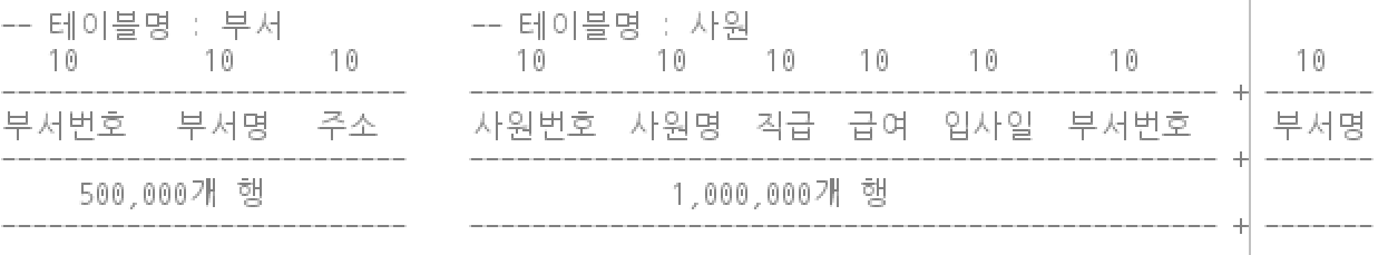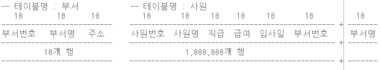 부서 테이블과 사원 테이블을 JOIN 했을 때의 크기를 구해보면 다음과 같다.