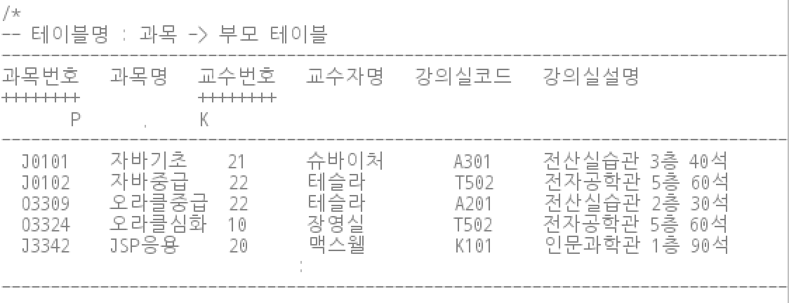 제 3 정규화는 식별자가 아닌 컬럼이 식별자가 아닌 컬럼에 대해 의존적인 상황이라면, 이를 분리하여 새로운 테이블을 생성해 주는 과정이다. 위 과목 테이블에서 강의실 코드와 강의실 설명은 기본키가 아님에도 불구하고 서로 의존적인 관계이다. 때문에 이 둘을 서로 다른 테이블에 분리해 줘야 한다.