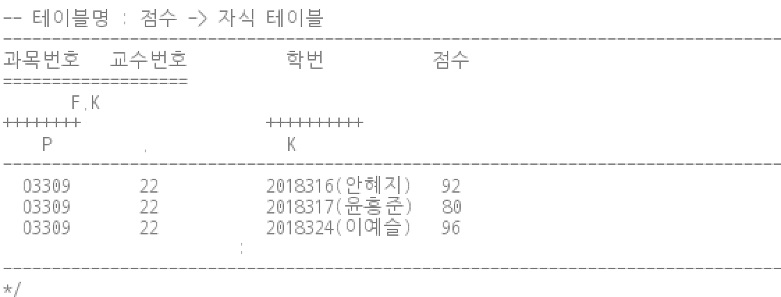 교수번호는 중복된 값이 있기 때문에 단독으로 존재할 수 없는 기본키이지만 서로 같이 붙여놓고 보면 단독으로 존재할 수 있는 Composite column 기본키가 된다. 그러므로 여기서는 과목 테이블의 과목번호와 교수번호 기본키를 따로 나눠줘야 할것이다. 또한 점수 테이블 또한 과목번호와 학번 둘 다 컬럼의 경우 단독으로 존재할 수 없지만 서로 붙이면 기본키가 될 수 있기 때문에 과목번호, 학번을 따로 나눠줘야 한다.