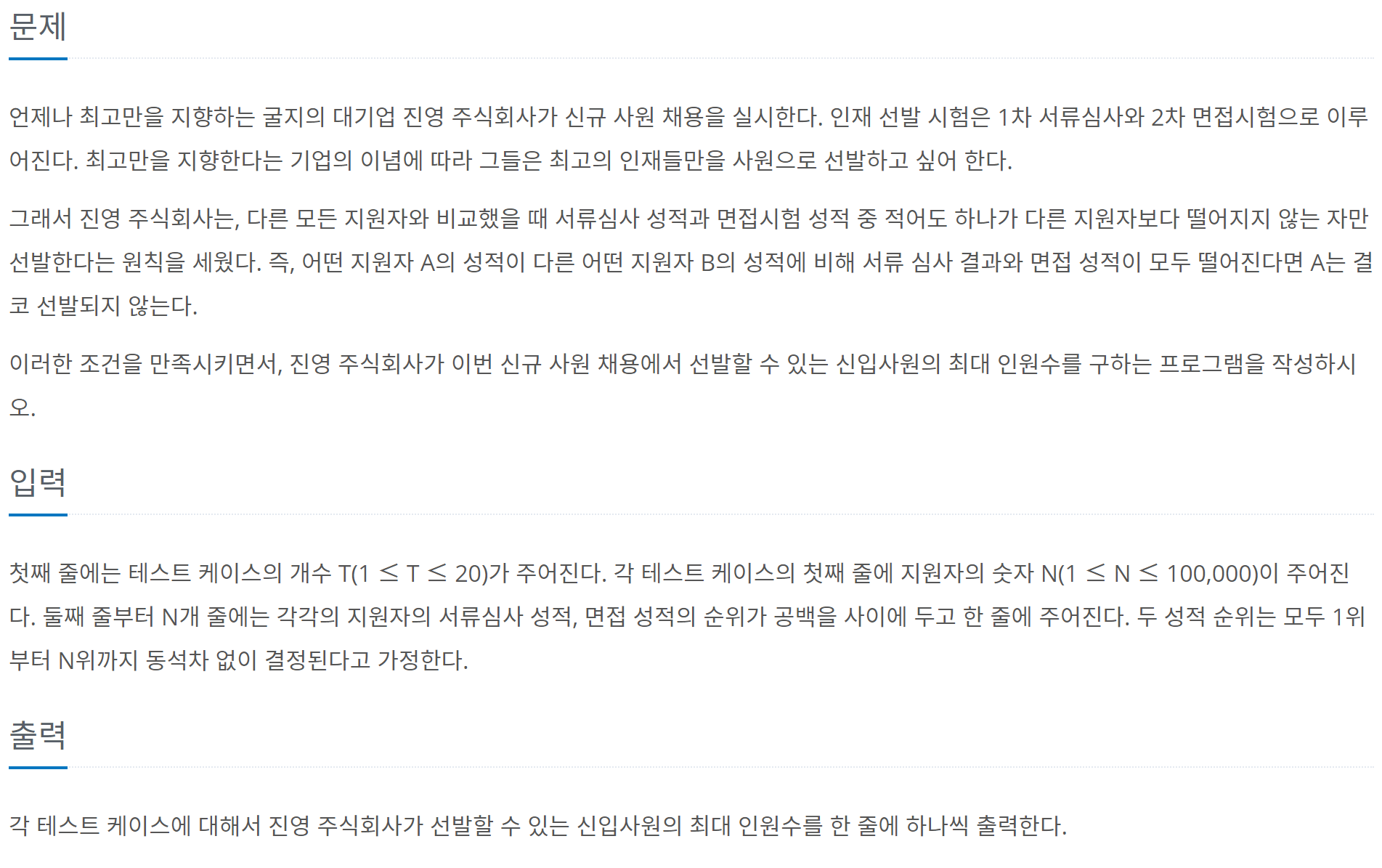 - 만약 지원자의 면접 순위가 N보다 작은 경우 조건에 만족하므로 선발하고 순위를 다시 N에 기록한다.