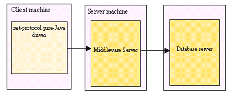 자바 애플릿이나 어플리케이션이 DBMS에 직접 접근하지 않고 중간에 미들웨어(미들티어)를 거쳐서 데이터베이스에 접근하는 방식이다.
