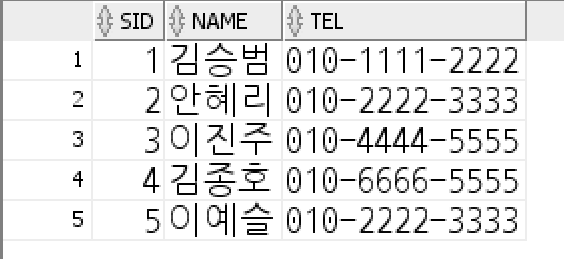 SELECT SID, NAME, TEL FROM TBL_JDBC_TEST
