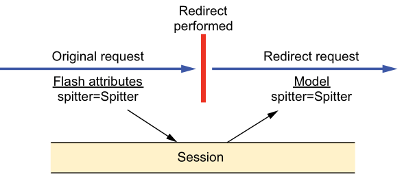 다음 그림은 Redirect의 특징을 나타낸다. Spitter라는 객체를 보내려고 한다. 하지만 Redirect가 발생하면 원래 요청은 끊어지고, 새로 HTTP GET 요청이 시작된다. 왜냐하면 Redirect는 서버가 브라우저(사용자)에게 "Redirect할 URL로 GET 요청 방식을 사용해 Redirect 해라" 라고 명령을 내리는 것이기 때문이다. 그러므로 Model에 담겨져 있던 데이터 Spitter 객체는 소멸한다. 결국 Redirect를 사용하여 Model 객체를 전달하는 것은 의미가 없다. 그러면 Redirect를 사용해서 데이터를 보내는 방법은 없을까?