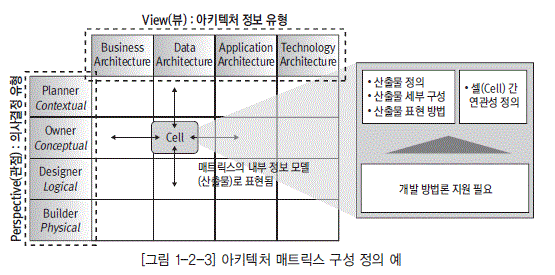 의사결정 유형과 아키텍처정보 유형으로 구성된 매트릭스의 각 셀에 필요한 산출물을 정의한다. 산출물 정의는 어떤 방법론을 사용하는가와 기업의 업무 특성이나 문화에 의해 좌우된다.