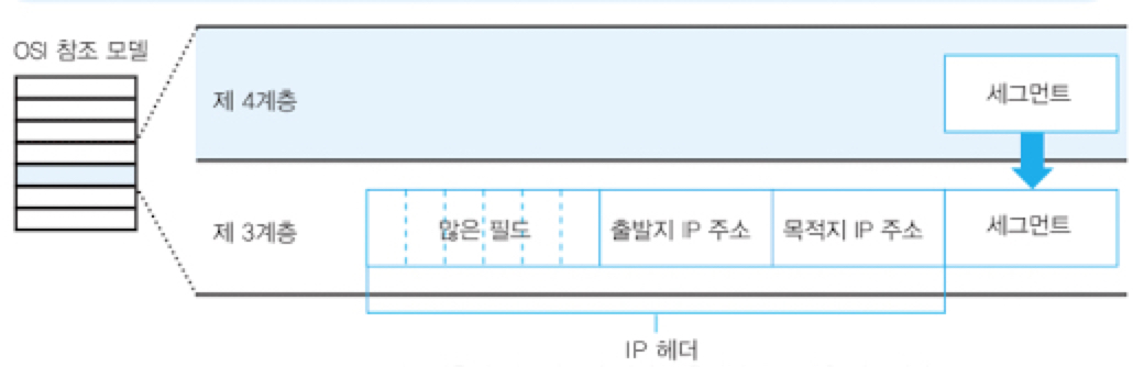 IP는 제 4계층(전송 계층)으로부터 받은 세그먼트에 'IP 헤더'를 붙여 패킷으로 만든다. IP 헤더는 패킷의 목적지를 나타내는 택배 전표와 같다. 패킷은 바다 밑부터 산속까지 전 세계의 모든 네트워크를 경유하기 때문에 IP 헤더는 그러한 환경 차이를 흡수할 수 있도록 많은 필드로 구성되어 있다.