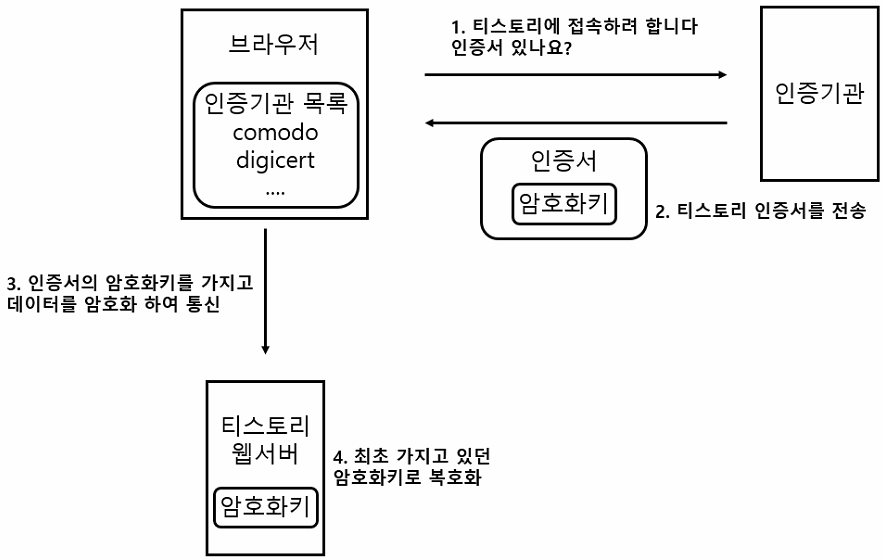 따라서 브라우저는 웹 서버와 통신하기 이전에 인증기관 리스트를 확인하여 인증기관에 현재 자신이 통신하려는 웹 서버의 인증서가 있는지 확인하고 있으면 인증서를 받는다.