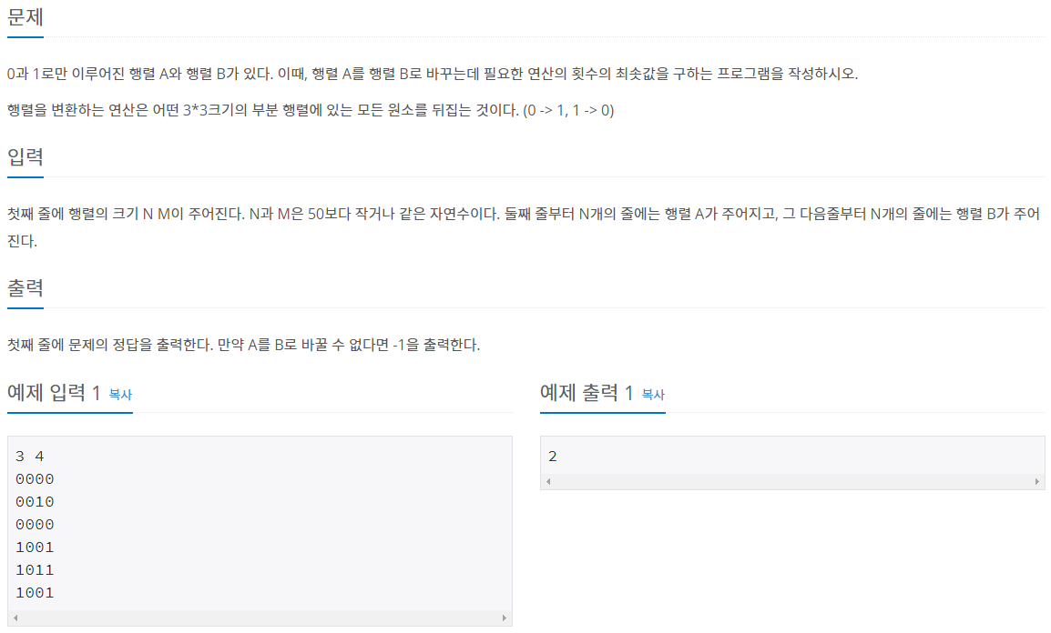 만약 둘 다 3보다 큰 경우 1행부터 N - 3행까지 그리고 1열부터 M - 3열까지 A와 B가 특정위치에서 서로 같은지를 검사하며 다른 경우 그 위치에서부터 XOR를 진행한다. 모두 끝난 후에 행렬 A와 B가 같은지 확인하면 끝이 난다.