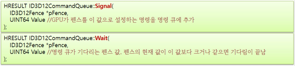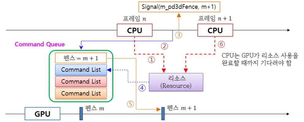 위 숫자 순으로 보면 어떤 순서로 돌아가는지 알 수 있을것이다. GPU는 현재 프레임에서 필요한 명령들을 완료하면 펜스 객체의 값을 하나 증가시키는 명령을 실행하게 된다. CPU는 그 작업을 하기 전까지 대기하는 것이다.